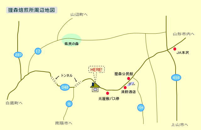 山交バスの停留所「元屋敷」と「六角」のちょうど中間です。
