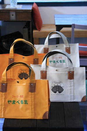 現役活躍中だった『やまべ牛乳』の配達バッグを譲ってもらって、狸森焙煎所ではストーブの季節、薪運びに活躍してもらって